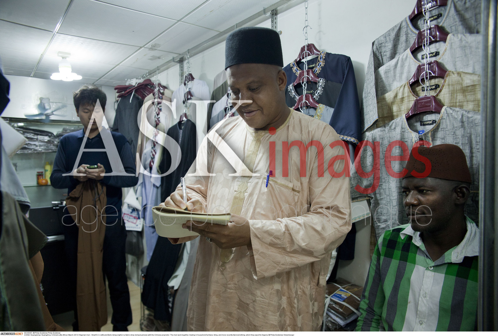 | Description | CHINA / Guangdong / Guangzhou / China's Little Africa / .NIgerian men - Sharif A. A. (left) and Bello Ishaq (right) in a fabric shop doing business with the Chinese proprietor. The men work together, trading in household furniture, tiling, and more recently fabrics/clothing, which they export to Nigeria...© Philip Gostelow / Anzenberger |