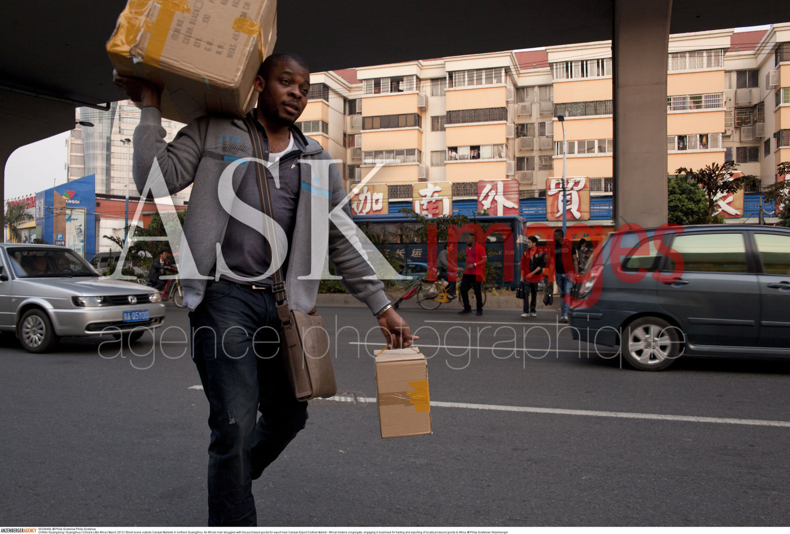 | Description | CHINA / Guangdong / Guangzhou / China's Little Africa / .Street scene outside Canaan Markets in northern Guangzhou. An African man struggles with his purchased goods for export near Canaan Export Clothes Market - African traders congregate, engaging in business for trading and exporting of locally produced goods to Africa...© Philip Gostelow / Anzenberger |