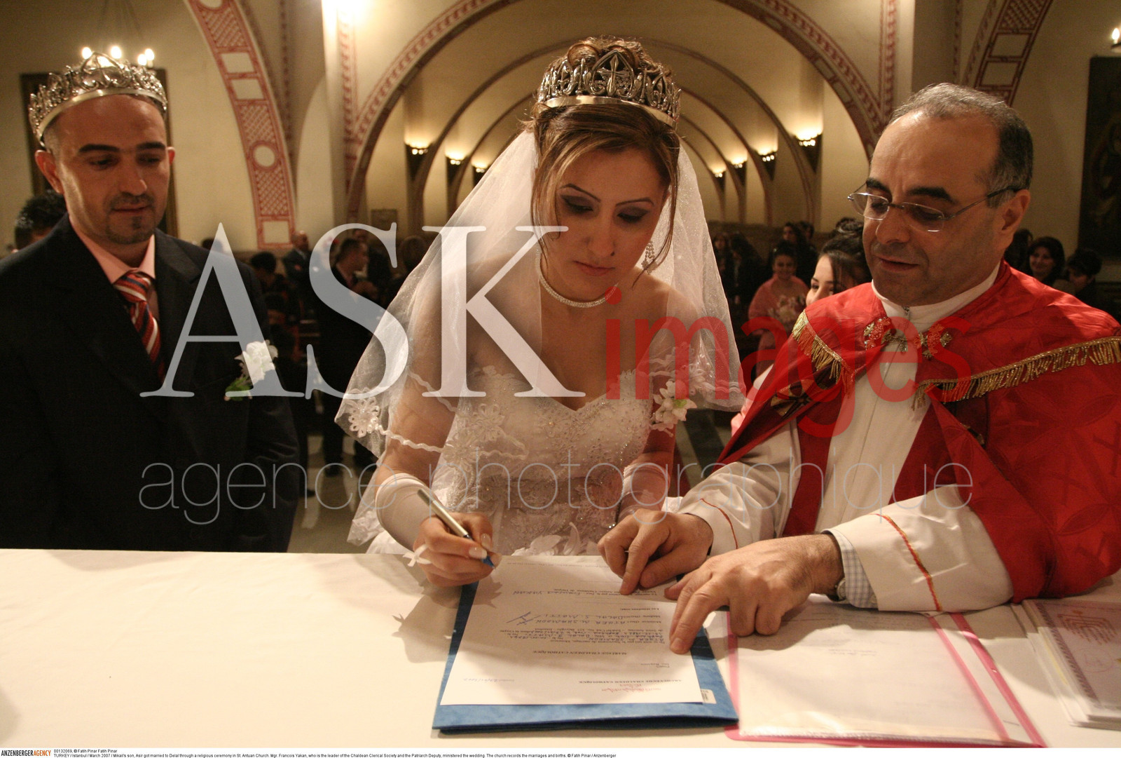 | Description | TURKEY / Istanbul / .Mikail's son, Asir got married to Delal through a religious ceremony in St. Antuan Church. Mgr. Francois Yakan, who is the leader of the Chaldean Clerical Society and the Patriarch Deputy, ministered the wedding. The church records the marriages and births. © Fatih Pinar/Anzenberger/ASK Images |