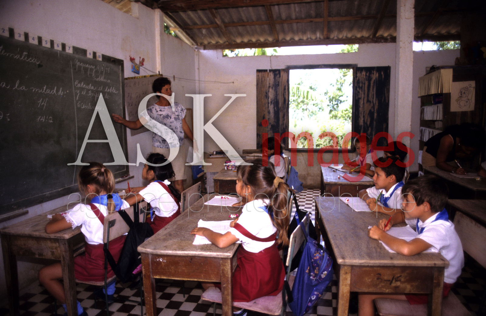Schoolchildren at school listening to their teacher, Cuba.