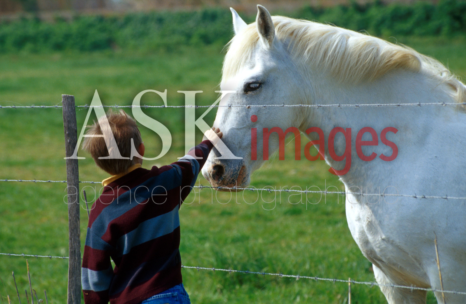 France, Camargue, A child patting a horse..
