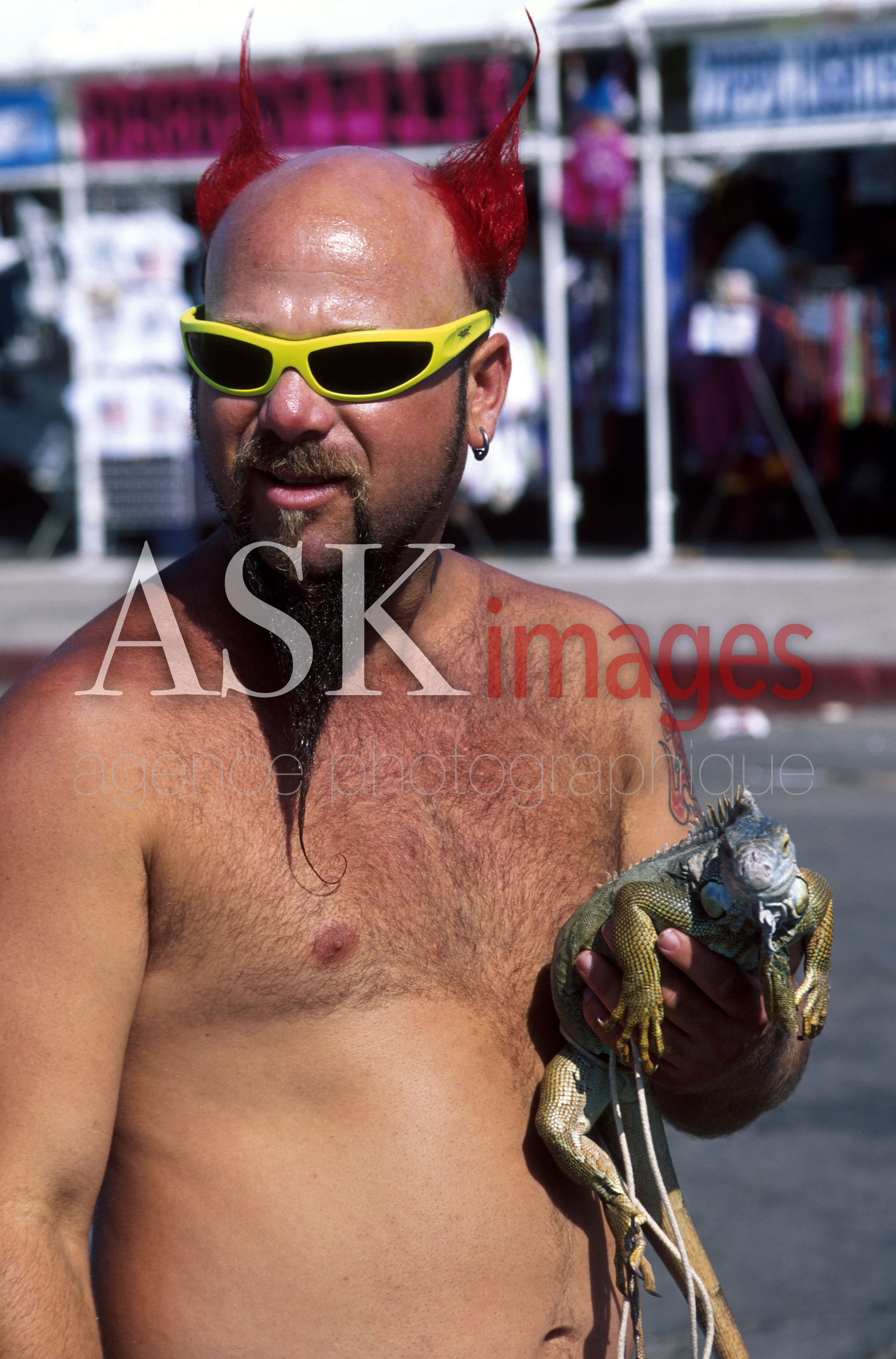 | Description | California, Los Angeles, Venice Beach, a man with an iguana. |