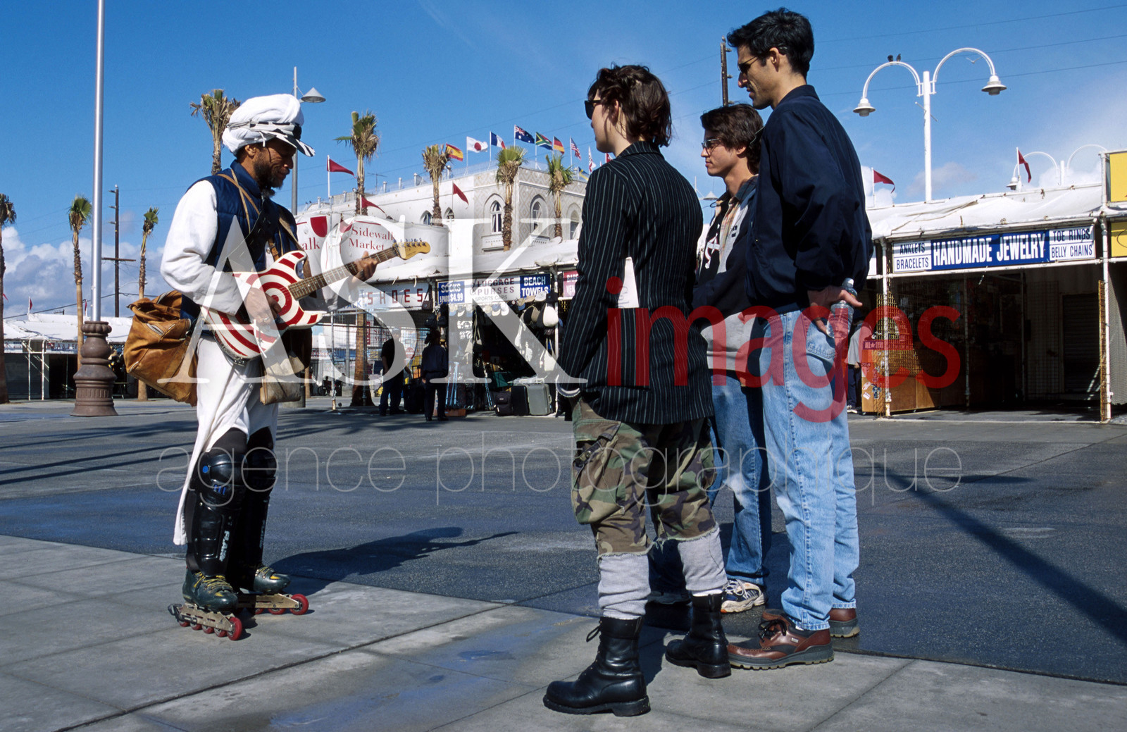 | Description | California, Los Angeles, Venice beach, guitar player on roller skates playing guitar.. |