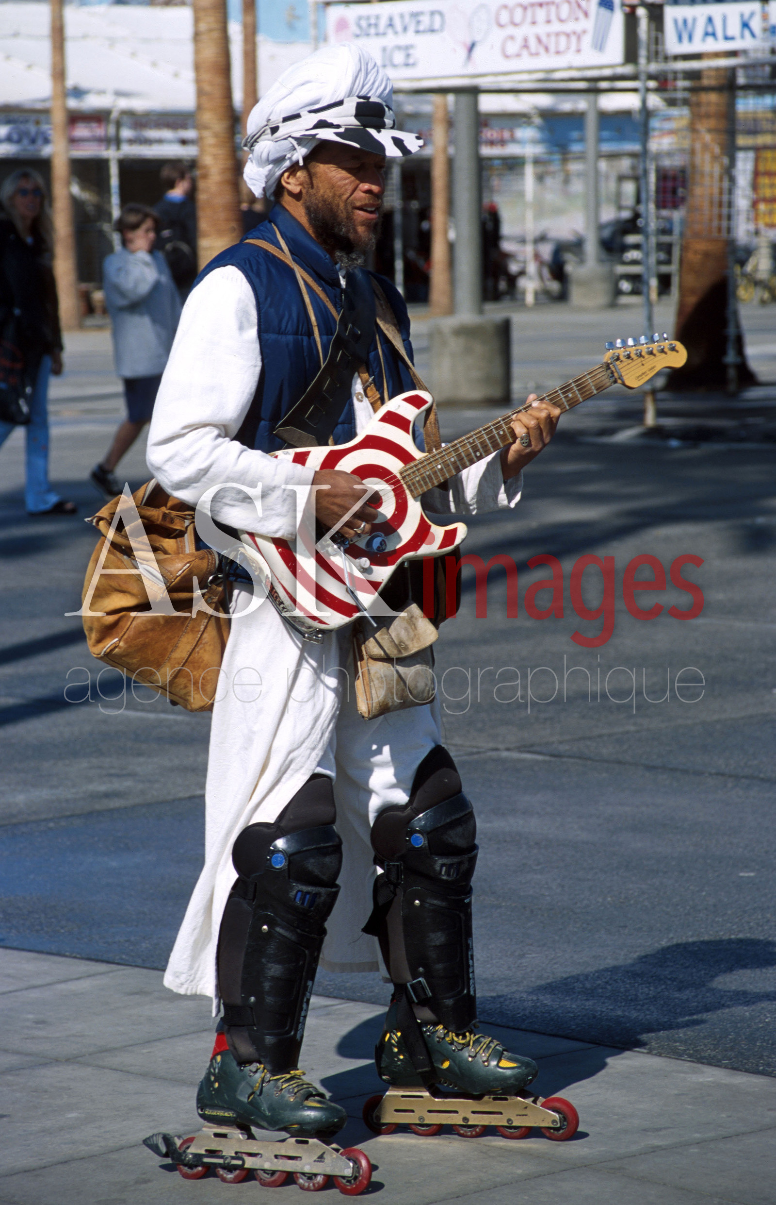 | Description | California, Los Angeles, Venice Beach, a guitar player on roller skates playing guitar ... |