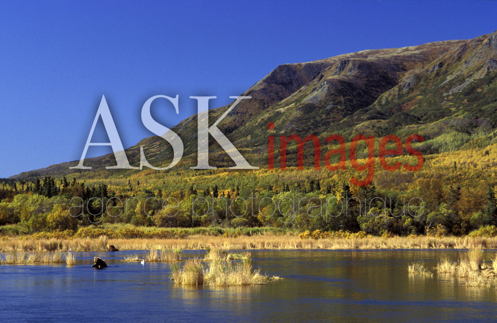 | Description | Dumpling mountains towering above Brooks river and a brown bear. |
