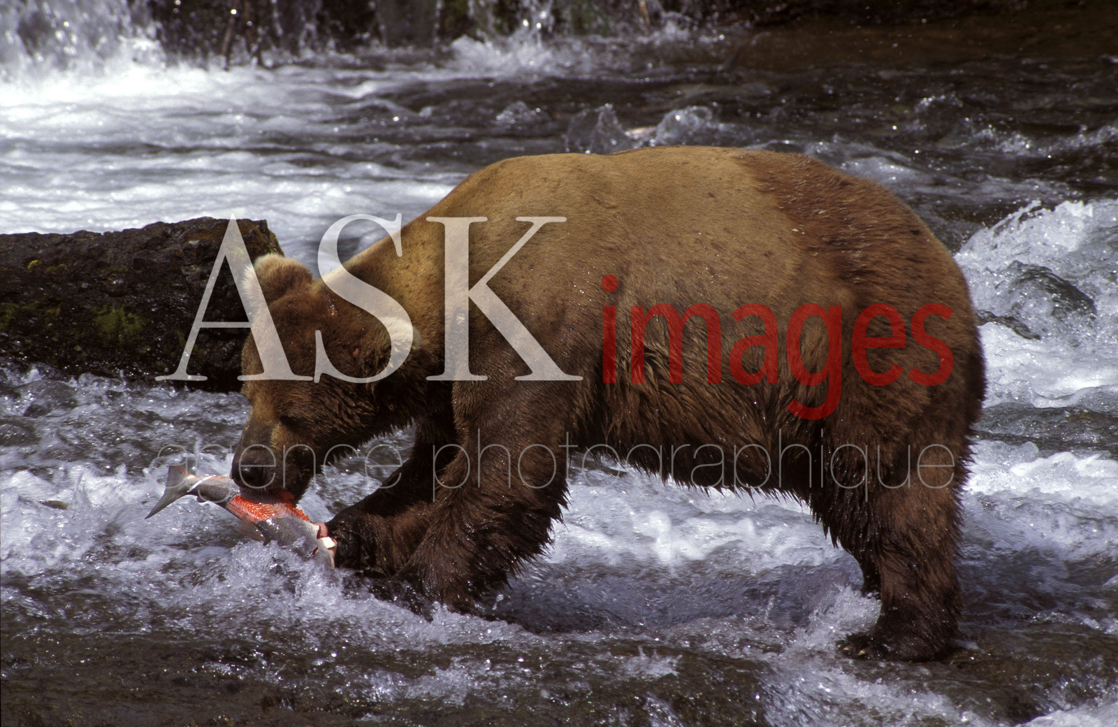 | Description | Brooks river. Une femelle attrape un saumon. |