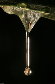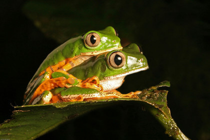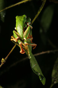 • Accouplement de phyllomedisa tomopterna. Le male monte sur la femelle. Celle-ci descend au bas de la feuille et commence a pondre. Au fur et a mesure de l'amplexus, elle referme la feuille derriere elle, a l'interieur de laquelle sont deposes ses oeufs. Les futurs tetard se developpent pendant quelques jours a l'interieure d'une gelatine protectrice avant de tomber directement dans l'eau au dessous d'eux. Guyane