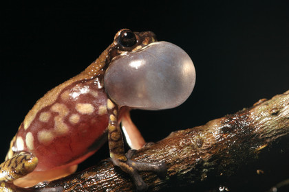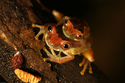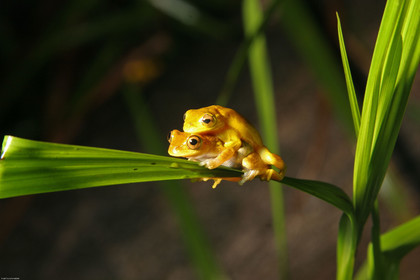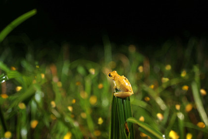 • Rassemblement massif de grenouilles hyla minuta. Une nuit par an, lors de la premiere grosse pluie de l'annee, ces grenouilles se regroupent autour de points d'eau afin de s'accoupler. Cette strategie de reproduction est appelee explosive breeding. Plusieurs milliers de grenouilles sont presentes durant l'evenement; le chant strident qu'elles emettent se diffuse sur plusieurs km en foret et atteint une puissance de 110 decibels au milieu de la mare. Ce rassemblement massif durant un temps tres court permet un brassage genetique important d'une part et une saturation de l'impact des predateurs d'autre part.