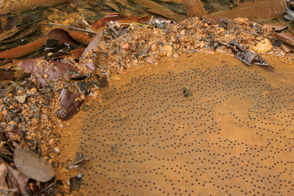 • Ponte de grenouille, hyla boans. Cette grenouille pond ses oeufs dans un cratere qu'elle creuse dans la terre. Amazonie,Guyane