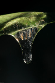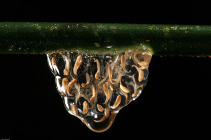 • Ponte de hyla brevifrons, sous une tige au dessus de la mare. Les tetards se developpent dans la gelatine, a l'abri des predateurs, puis tombent dans l'eau, guyane.