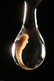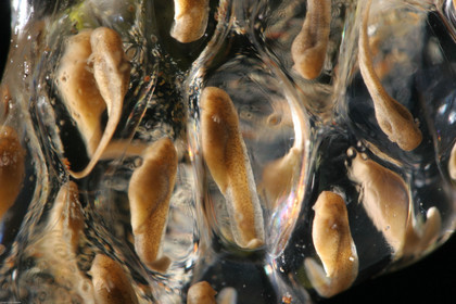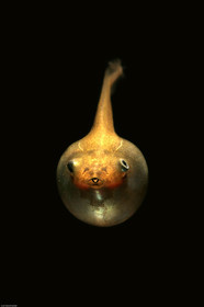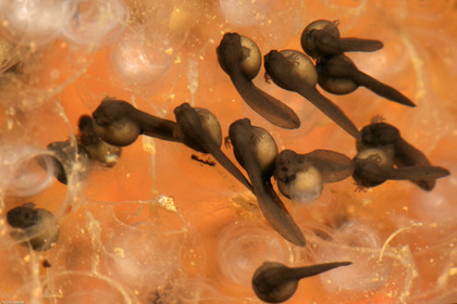 • Tetard de hyla boans sortant de l'oeuf. La respiration s'effectue a l'aide de branchies externes qui disparaitront quelques jours plus tard afin d'adopter une respiration pulmonaire. La ponte est deposee dans un cratere creuse par les parents dans de la terre, en bordure de mare, Amazonie, Guyane