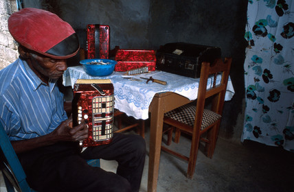 • Alfredo di Brito reparant un accordeon, Casa Grande. Ile de Sao Tiago, Cap Vert.