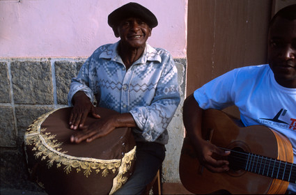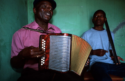 • Sema Lopi jouant de l'accordeon accompagne de son fils pendant la Funana, Sao Tiago, Cap Vert