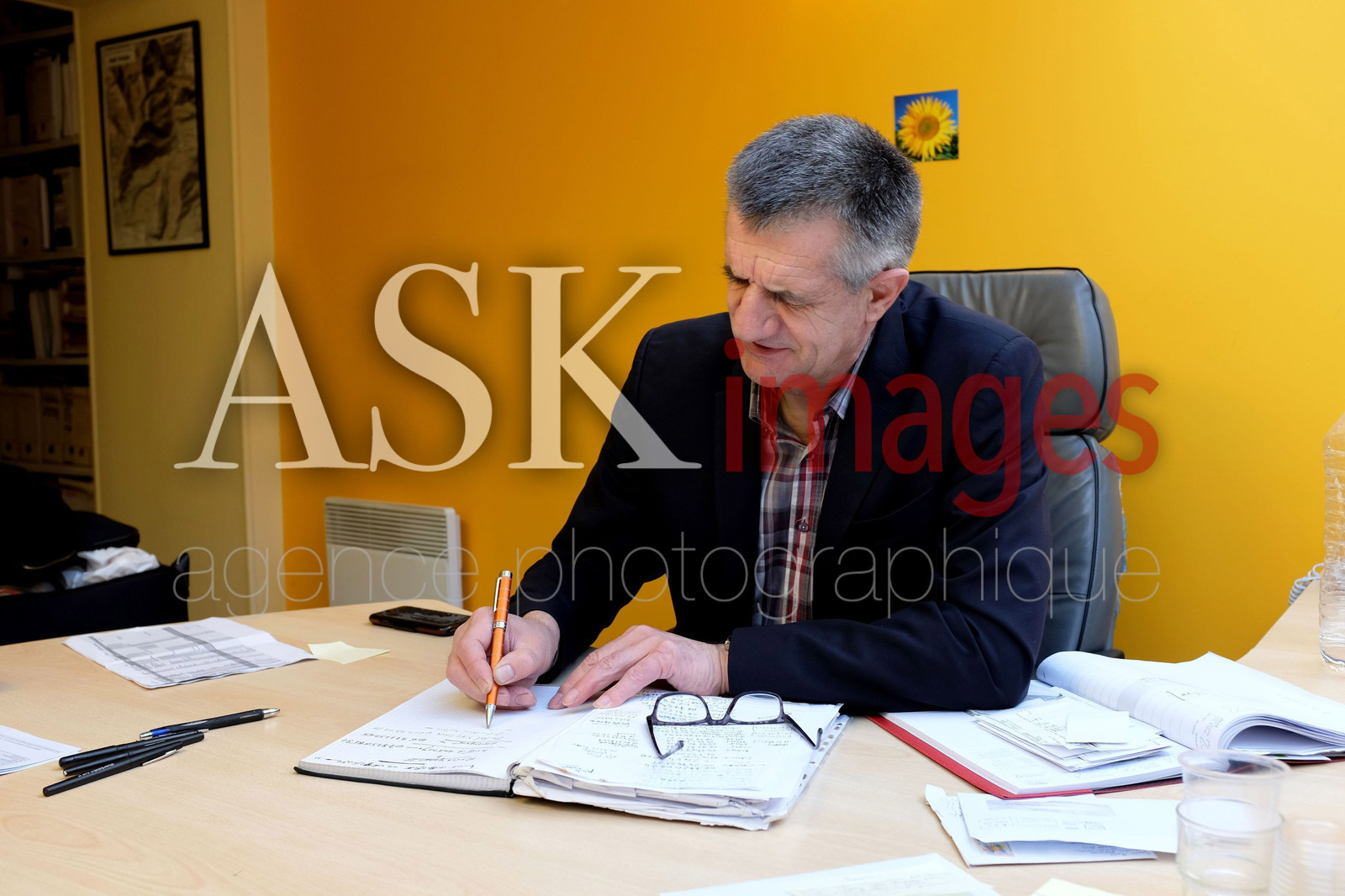 | Description | France, Nouvelle-Aquitaine, Pyrenees atlantiques, Lourdios Ichere, Mairie, Mr. Jean LASSALLE, depute de la 4 eme circonscription des pyrenees atlantiques et maire de Lourdios Ichere, candidat a l election presidentielle de 2017, ici dans son bureau de la commune de Lourdios Ichere. |