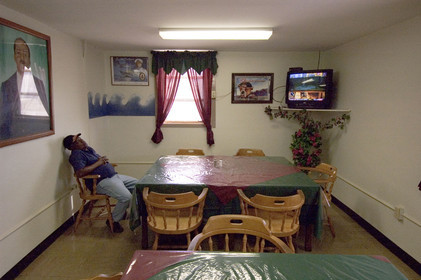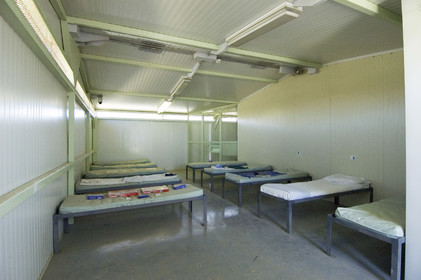 • CUBA, Guantanamo, Group barrack, Mirrored with symmetrical unit, guard stands on far side of gated door and observes 10 men in each unit (20) simultaneously.
