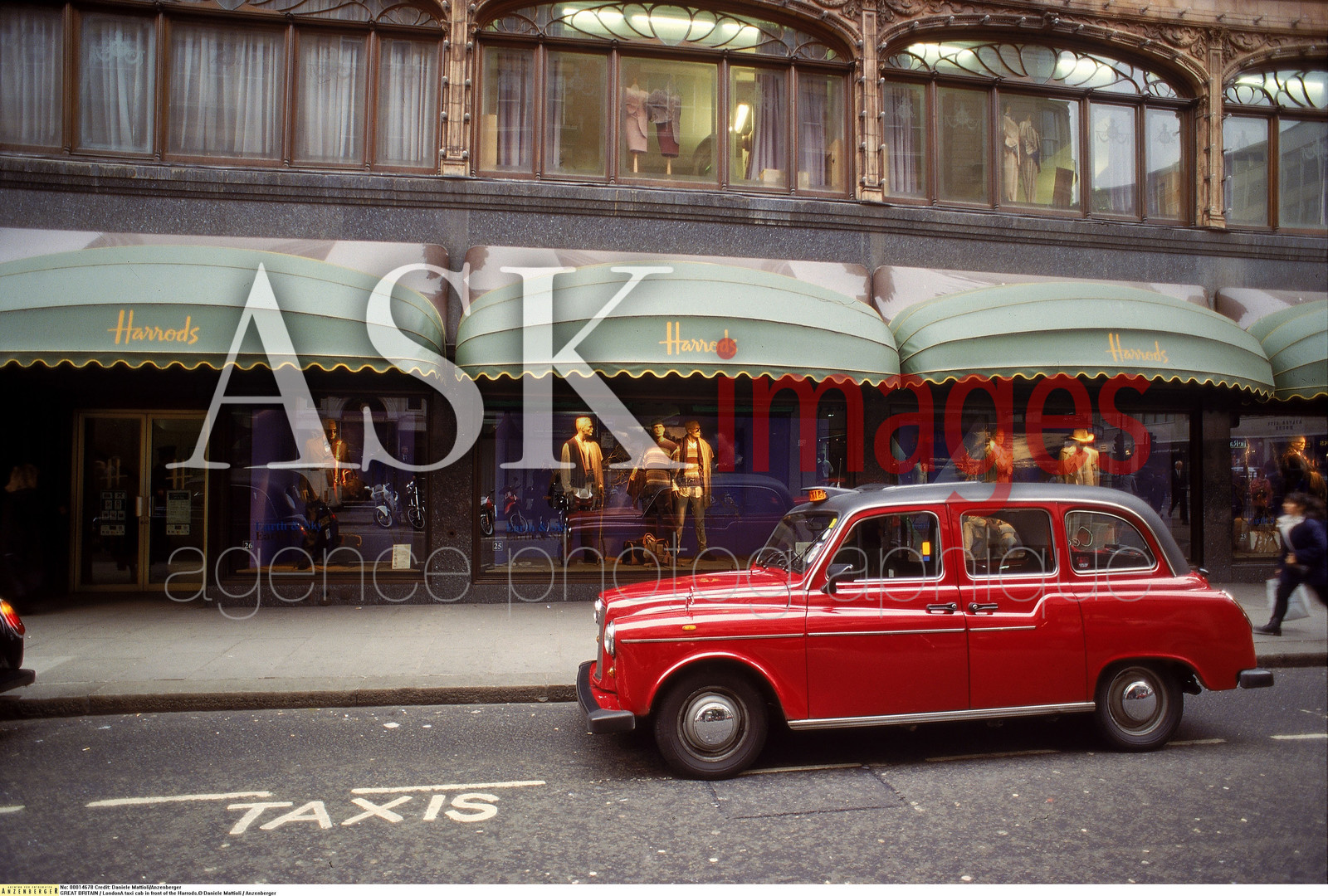 London. A taxi cab in front of the Harrods...