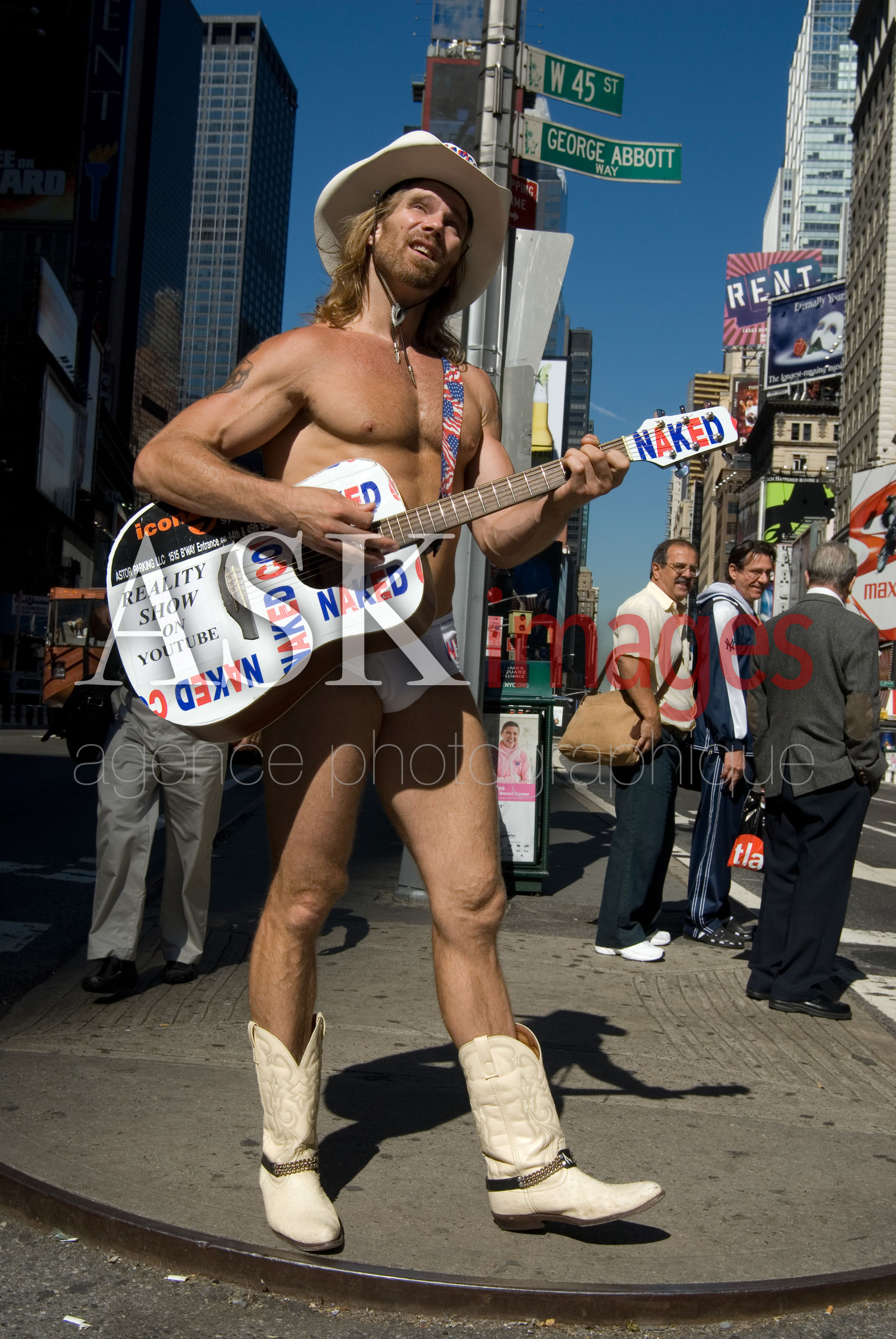 | Description | USA, New York. The famous 'Naked cowboy' singing song for the tourist almost all naked in Times Square. |