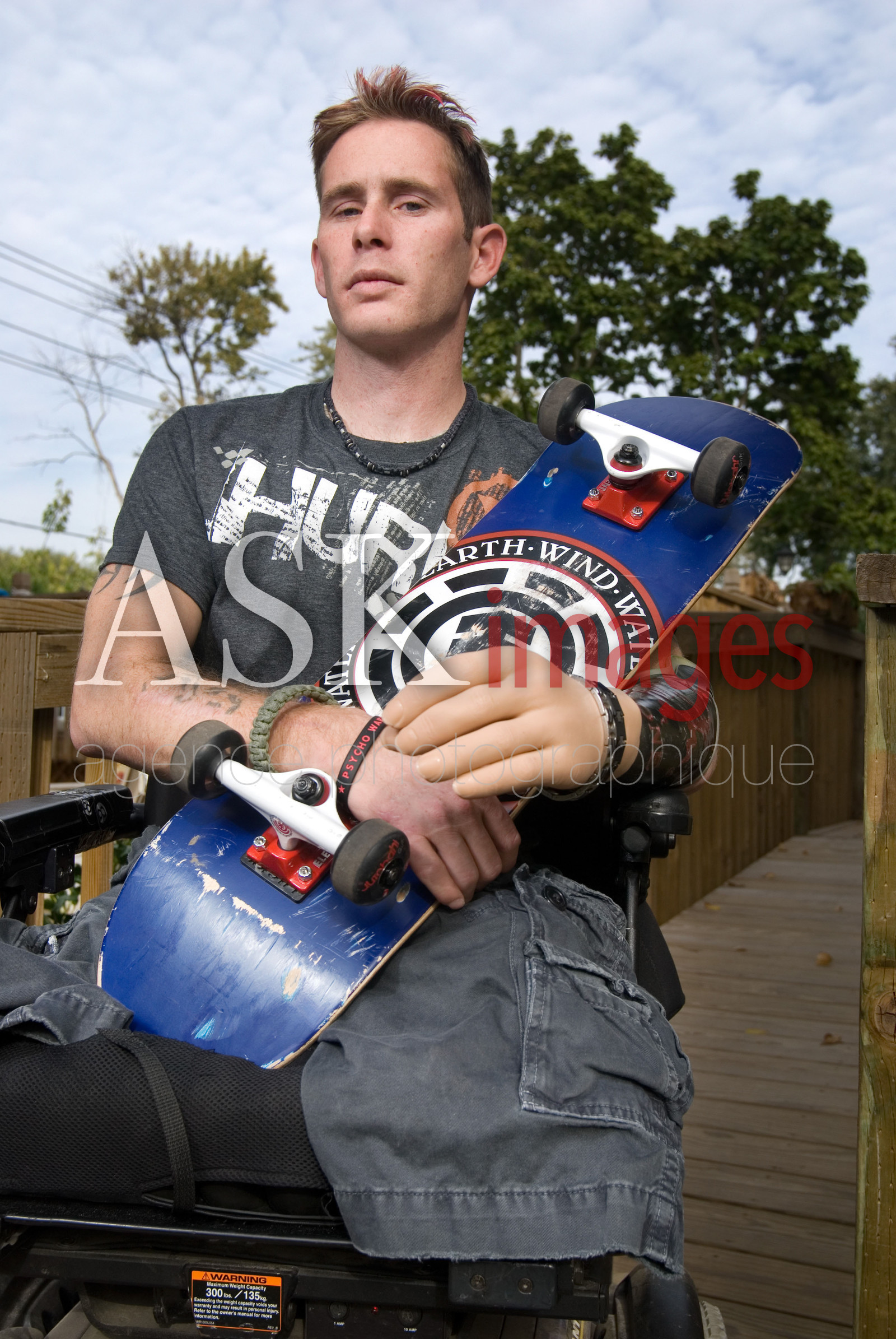 | Description | USA, Illinois, Rolling Meadows. Bryan Anderson, lost his legs and one arm for a bomb explosion while in Iraq war. Outside his house holding a skateboard, despite his physical condition he goes time to time to scate at the work helped by his best friend. |