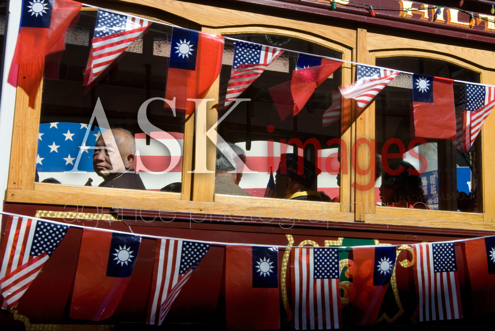 | Description | USA, San Francisco, China town. During the china day (day of taiwan independence from China) a chinese man is inside an old streetcar with american and tawainese flags.. |