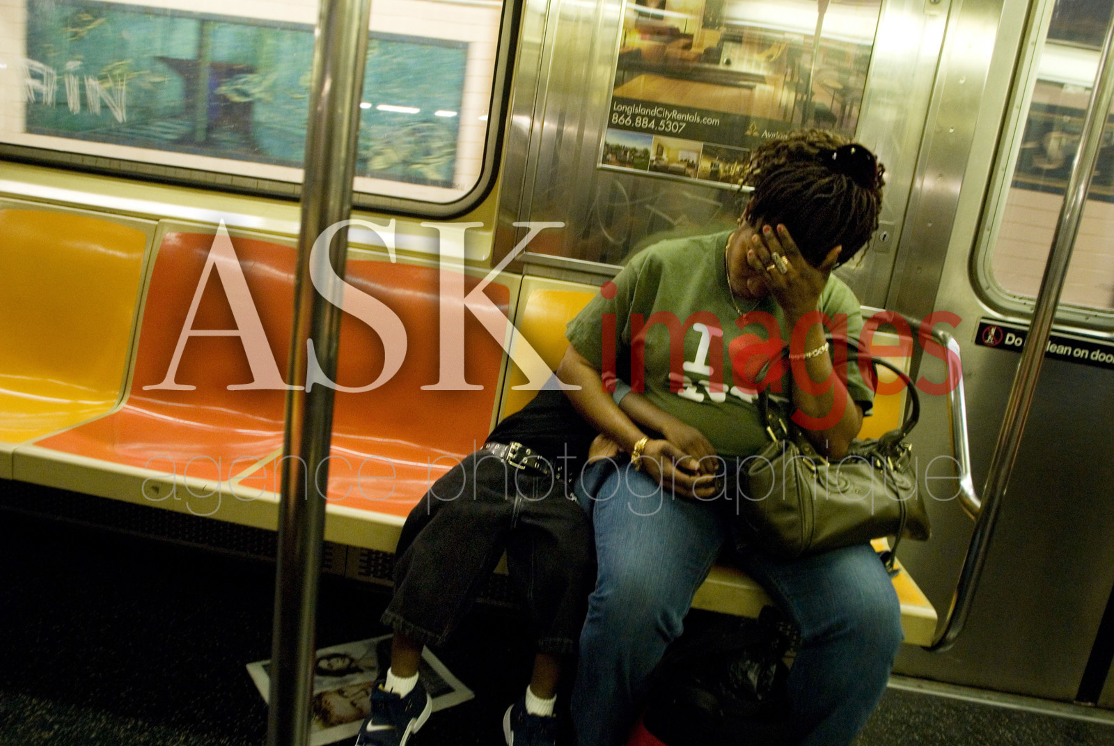| Description | USA, New York. A black woman with his son alone in desperation inside the subway, the boy is asleep and she hold his hands. |