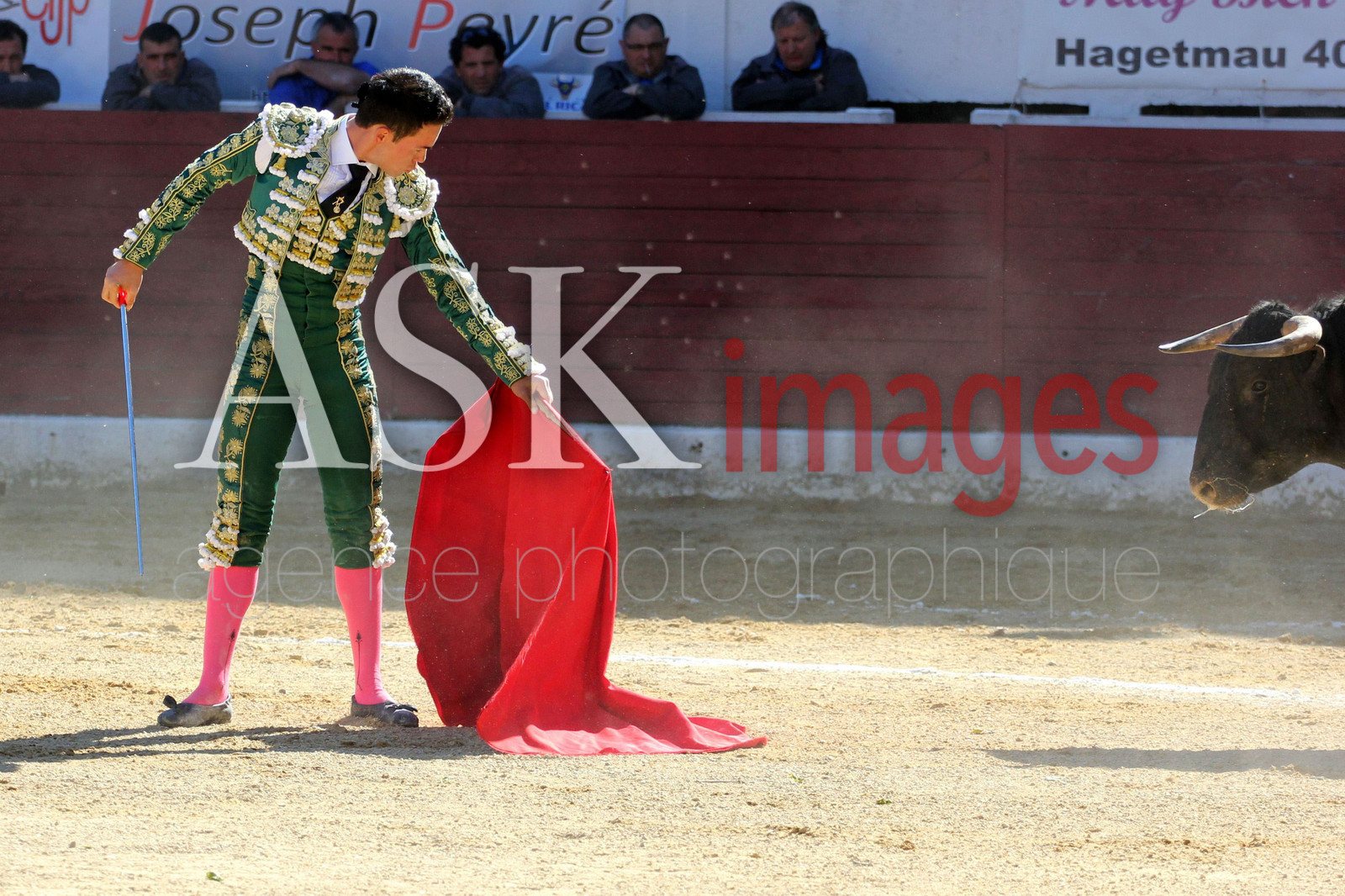 | Description | europe, france, aquitaine, landes, air sur l adour, le jeune matador, manolo vanegas pendant les novilladas de la madeleine de aire sur l adour, qui realise des passes sur un taureau de trois ans qui pese tout de meme 500 Kg, les banderilles sont planter dans le taureau |