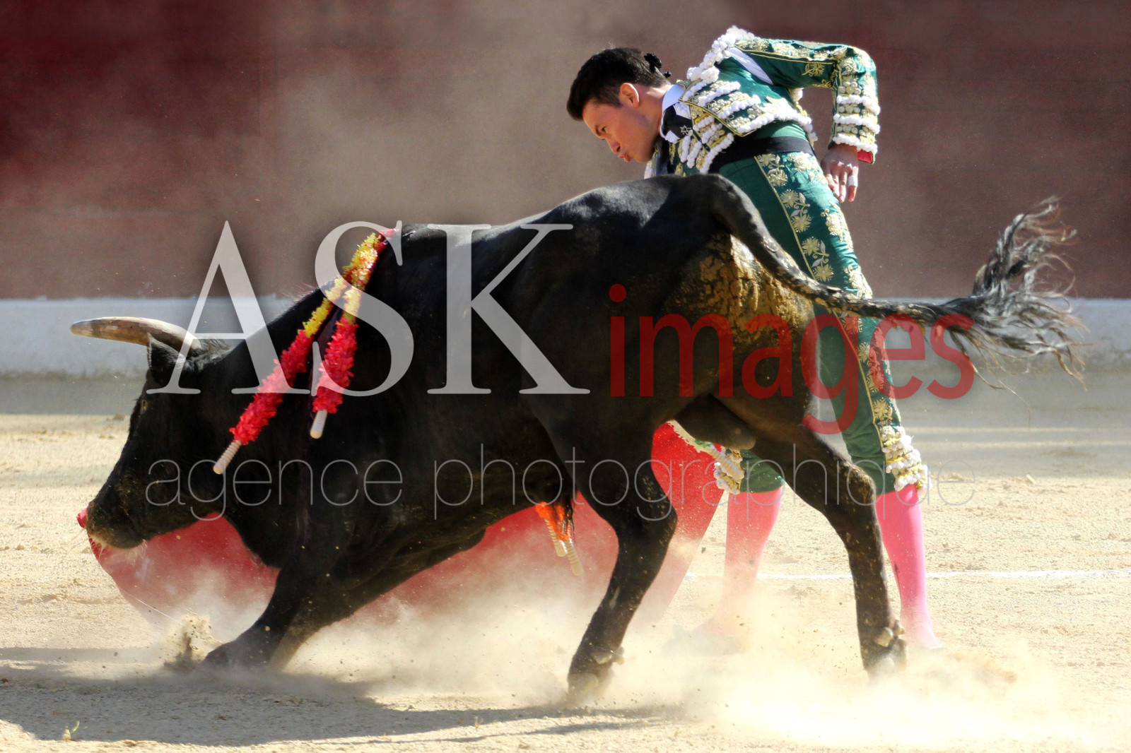 | Description | europe, france, aquitaine, landes, air sur l adour, le jeune matador, manolo vanegas pendant les novilladas de la madeleine de aire sur l adour, qui realise des passes sur un taureau de trois ans qui pese tout de meme 500 Kg, les banderilles sont planter dans le taureau |
