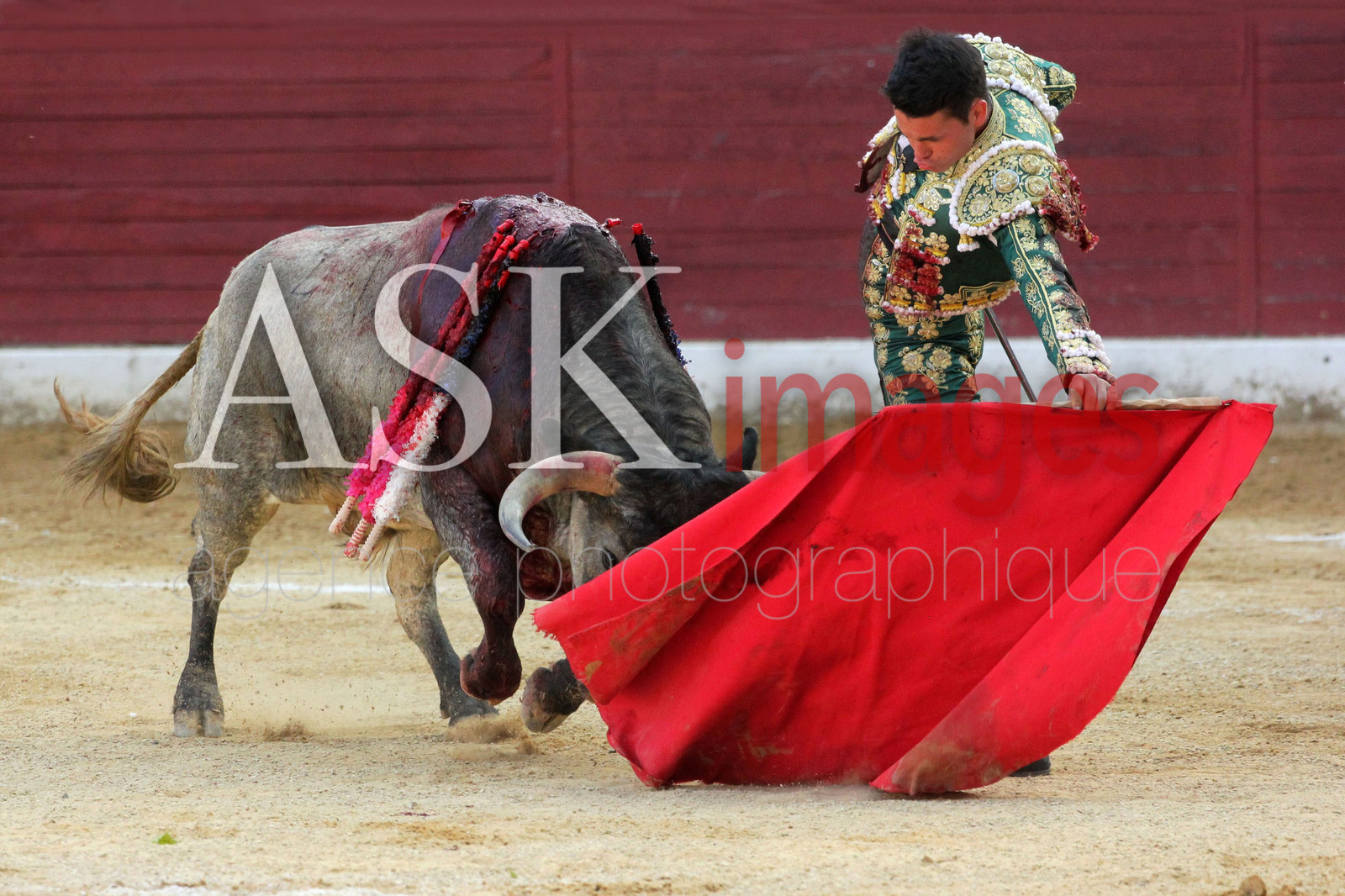 | Description | europe, france, aquitaine, landes, air sur l adour, le jeune matador, manolo vanegas pendant les novilladas de la madeleine de aire sur l adour, qui realise des passes sur un taureau de trois ans qui pese tout de meme 500 Kg, les banderilles sont planter dans le taureau |