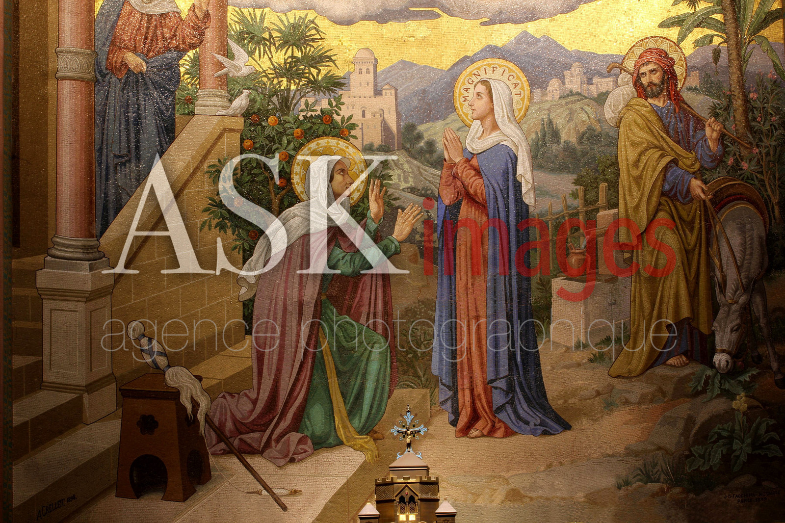 | Description | Mosaic of the basilica of Our Lady of the rosary, the visitation one of the fifteen radiant chapels each of them dedicated to one of the mysteries of the Rosary, designed by Grellet in 1903, Lourdes, Hautes-Pyrenees, Occitanie |