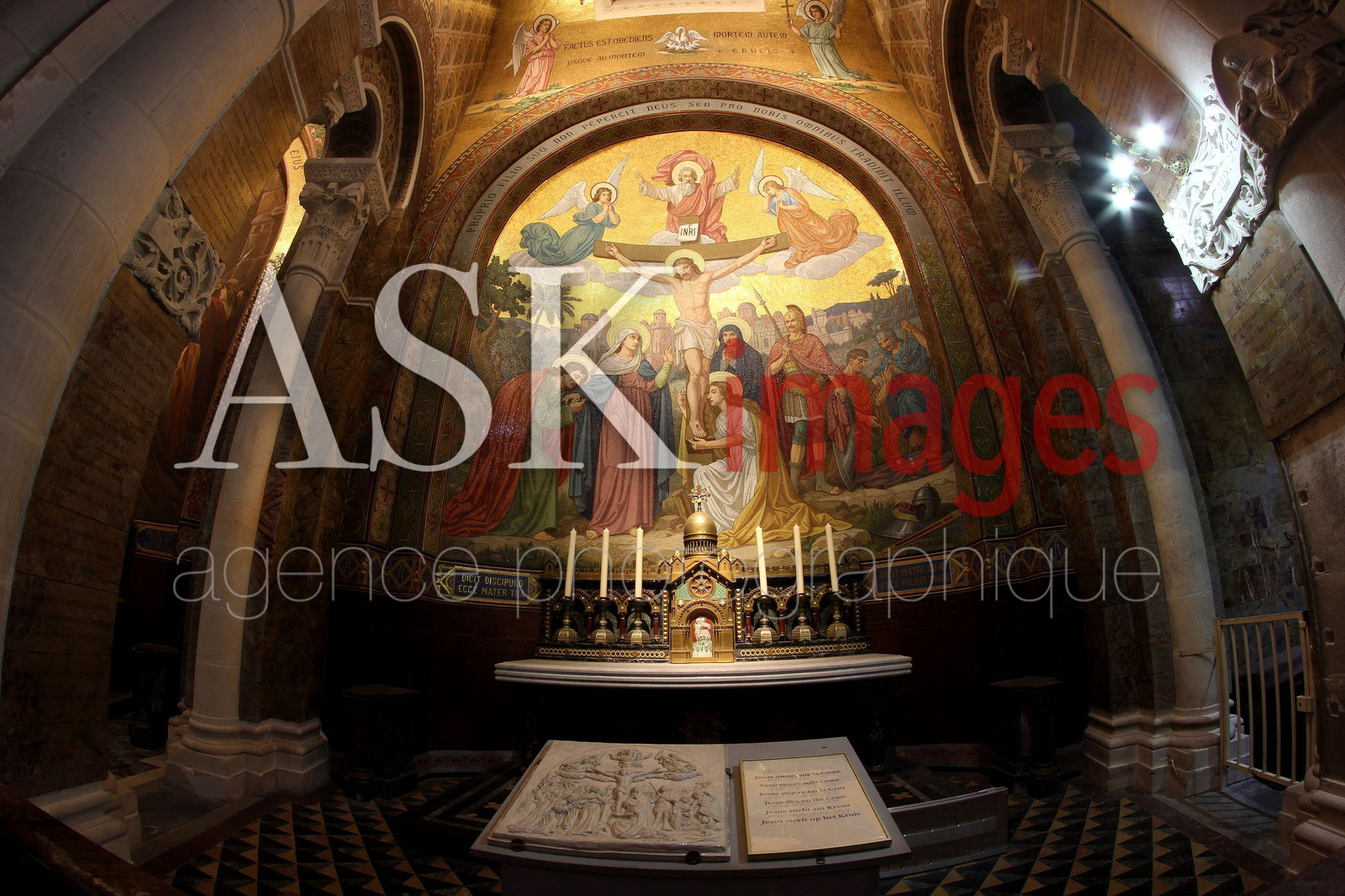 | Description | Europe, occitanie, hautes pyrenees, lourdes, basilique notre dame du rosaire, chapelle rayonnante du choeur representant les mysteres douloureux qui sont tires de scenes de la Passion du Christ, la crucifixion dessine par grellet en 1901. |