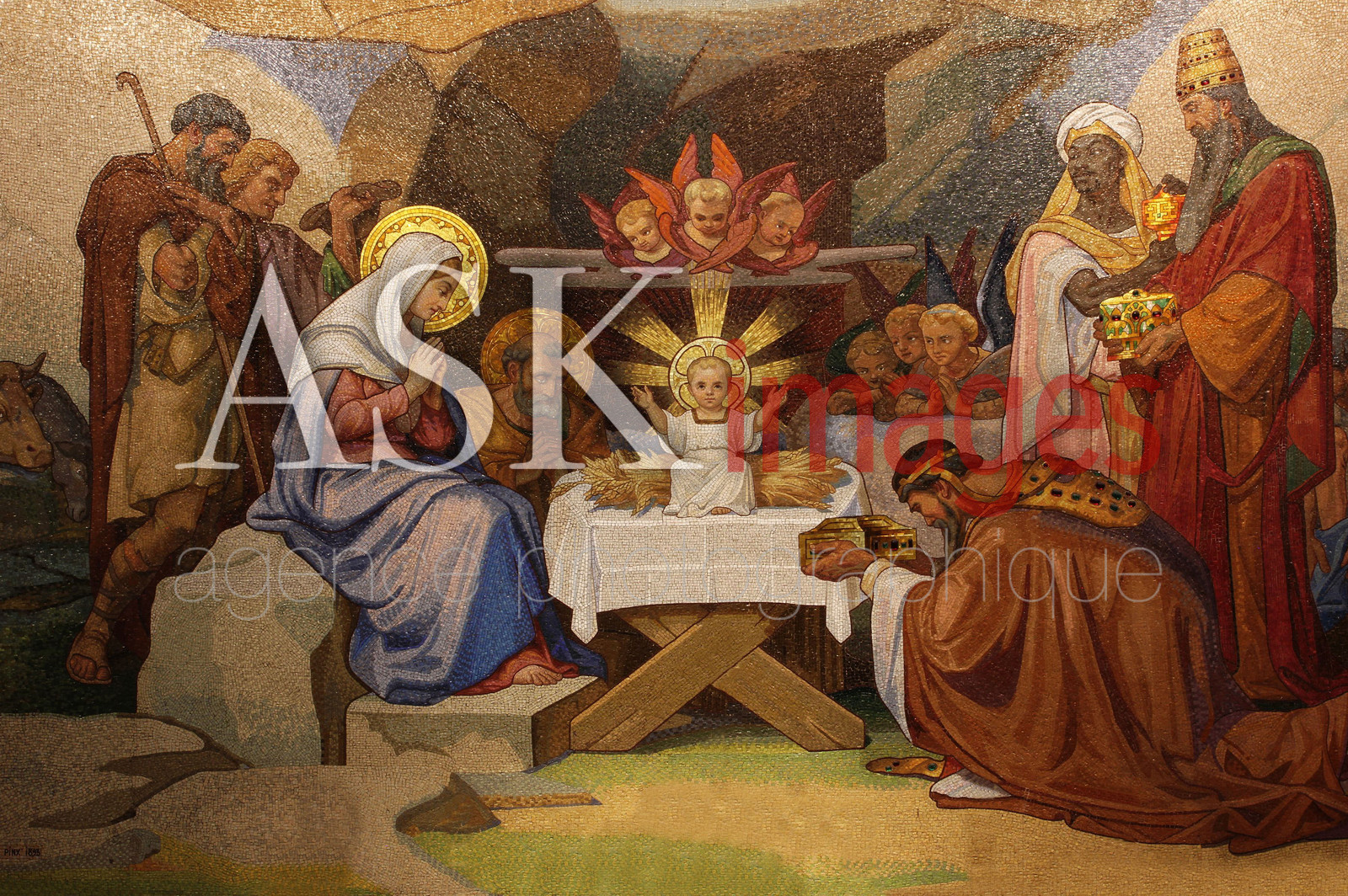 | Description | Europe, Occitanie, Hautes Pyrenees, Lourdes, mosaique de la basilique notre dame du rosaire, la nativite est la principale des quinze chapelles rayonnantes dediees chacune a l un des mysteres du Rosaire elle est dessinee par Melchior Doze en 1894 elles couvre 104 m2 c est le tableau principal, sous l'arcade principale, elle represente les mysteres joyeux qui racontent l'enfance du Christ et sont tires des evangiles de saint luc et saint matthieu. |