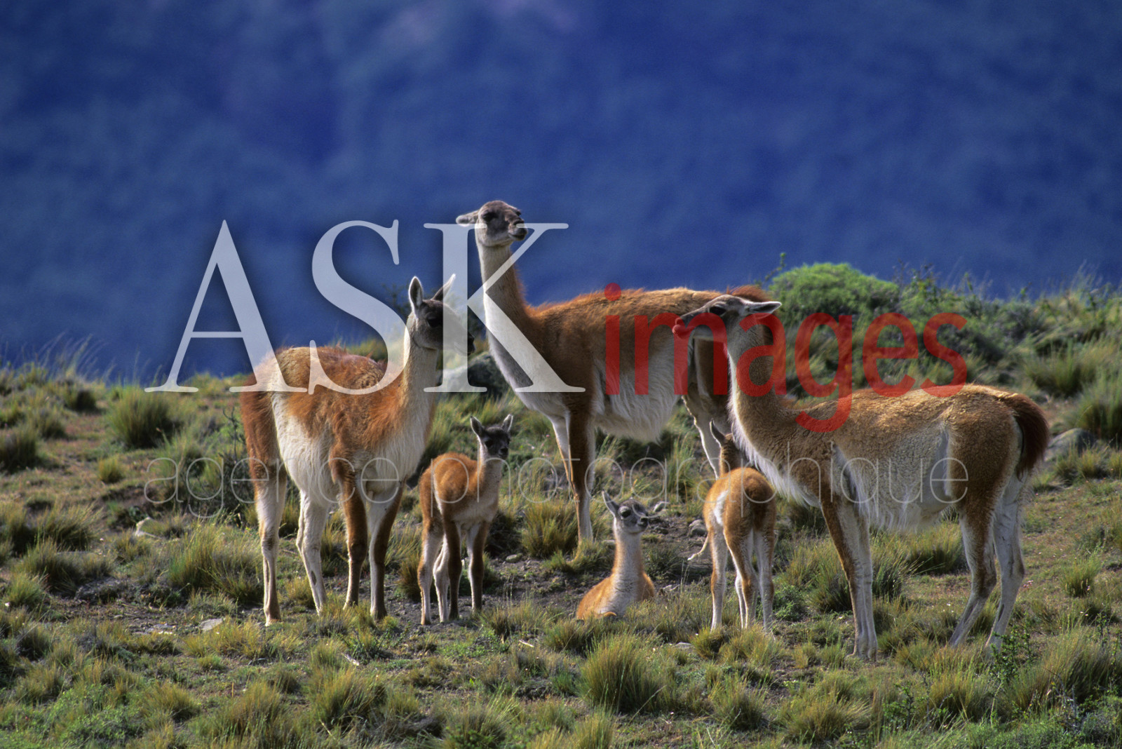| Description | CHILE, TORRES DEL PAINE NAT'L PARK, GUANACOS, FAMILY GROUP WITH BABIES (CHULENGOS) |