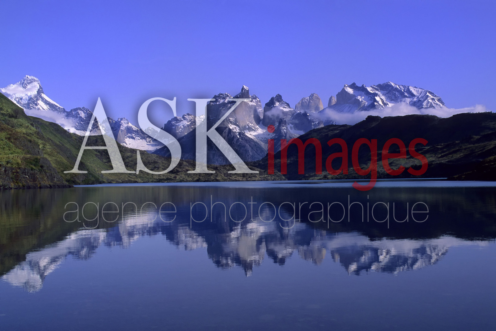 | Description | CHILE, TORRES DEL PAINE NATIONAL PARK, VIEW OF GRAND PAINE, CUERNOS DEL PAINE & ALM. NIETO MOUNTAINS, REFLECTING IN LAKE |
