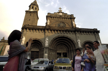 Wedding in Manila Cathedral. Intramuros. Manila. Philippines. The Manila Metropolitan Cathedral-Basilica, informally known as Manila Cathedral, is a Roman Catholic basilica located in Manila, Philippines, dedicated to the Blessed Virgin Mary as Our Lady of the Immaculate Conception, the Principal Patroness of the Philippines.