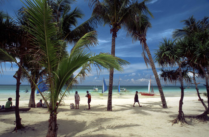 Tourists, Boats to practice sailing, White beach, Boracay, Philippines, Boracay is a small island in the Philippines located approximately 315km south of Manila