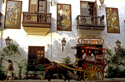 Kalesa ride, buggy horse carriage and large hotels in Malate. Facade of Barbara's Restaurant, Manila, Philippines, Barbara de los Reyes was brought up with a taste for elegance and good food.