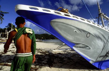 Boat painted as a shark, Bulabog beach, Boracay, Philippines, Boracay is a small island in the Philippines located approximately 315km south of Manila