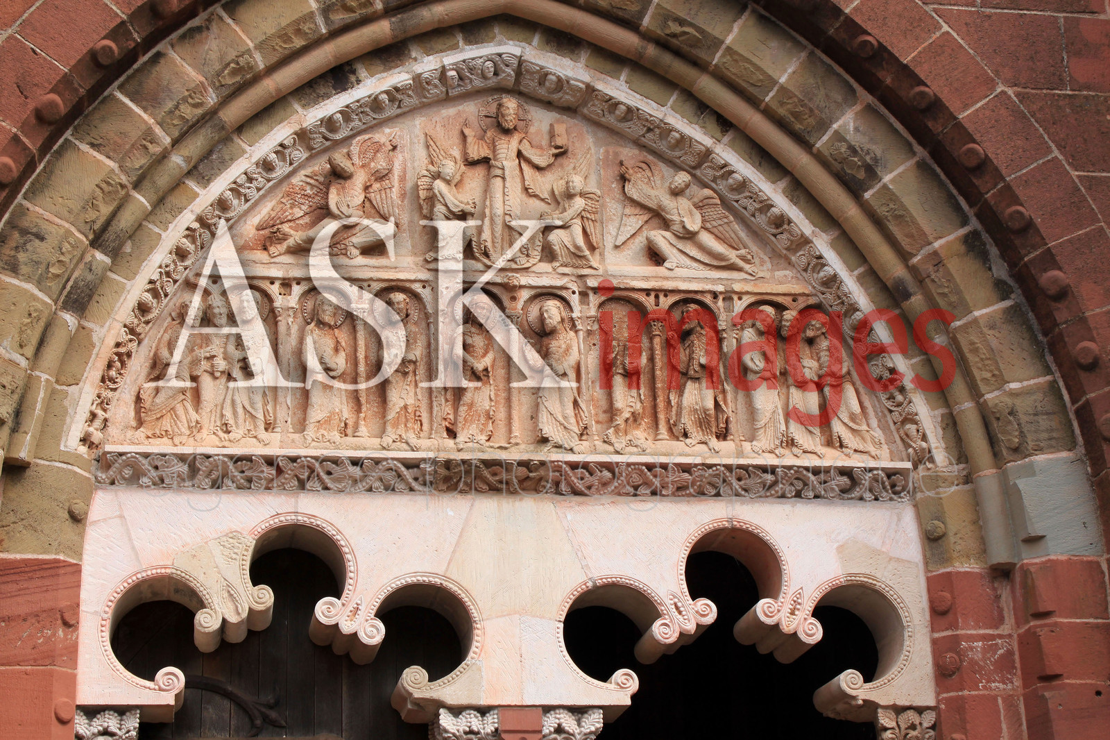 | Description | Limousin, Correze, Collonges-la-Rouge. Tympan en pierres blanches de l'eglise Saint-Pierre. |