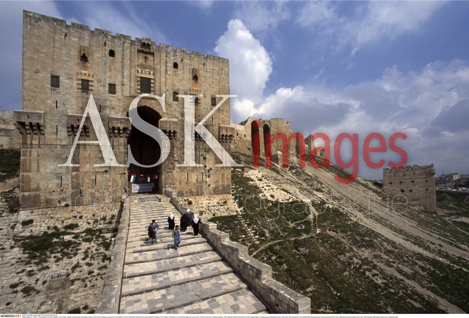 DescriptionSyria / Aleppo / The entrance to the Citadel. One of the oldest continuously inhabited cities in the world, Aleppo preserves remnants of more than four millennia of Near Eastern history. The Citadel of Aleppo is a densely layered microcosm of this long and complex history. The majority of the structures on the citadel were erected by the Ayyubids in the 12th and 13th centuries, but substantial structures are also preserved from the Ottoman period (beginning in the 16th century). © Fausto Giaccone/Anzenberger/ASK Images