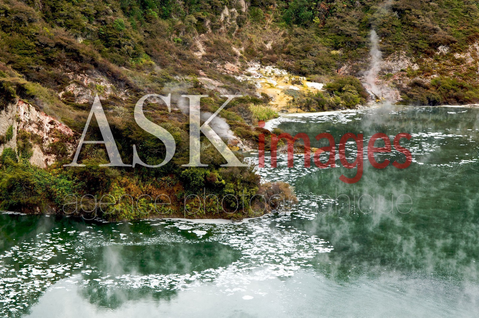 | Description | Fumaroles rising from Frying Pan hot water in Waimangu Valley, Rotorua volcanic area, North Island, New Zealand |