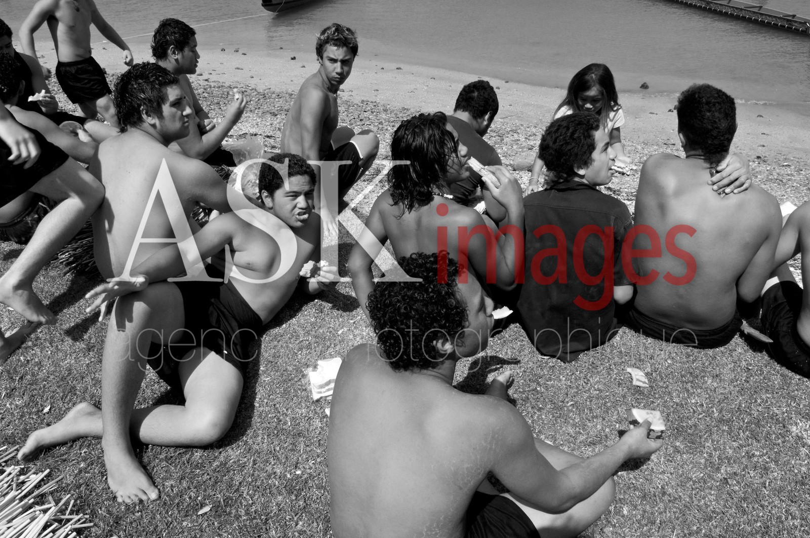 | Description | Members of a waka (traditional Maori canoe) crew rest after participating in Waitangi Day annual commemorations on Waitangi Treaty Grounds, Bay of Islands, North Island, New Zealand |