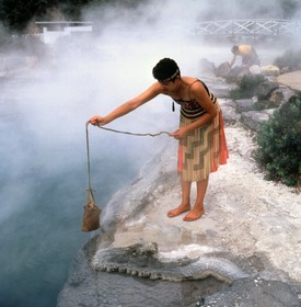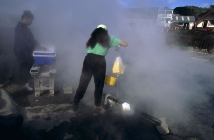 • A Maori woman is cooking in hot spring, Whakarewarewa, Rotorua; North Island, New Zealand.