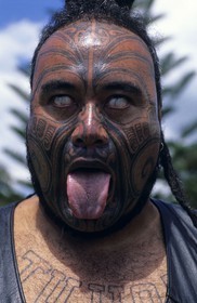 • Portrait of a Maori dancer from Arawa tribe, Rotorua, North Island, New Zealand.