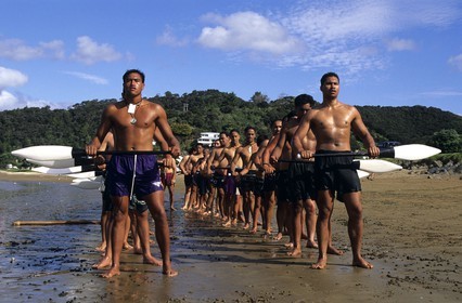 • Maori men learning how to drive a waka (Maori pirogue). Waitangi Day, North Island, New Zealand.