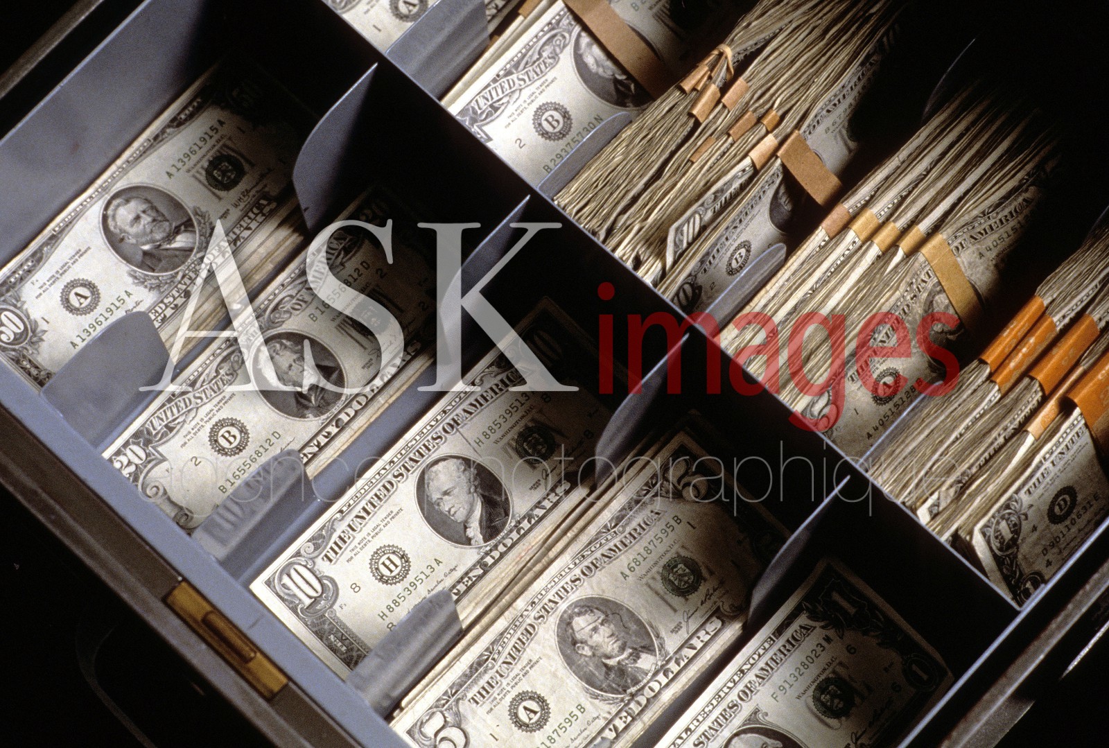 US currency, dollar bills in drawer.