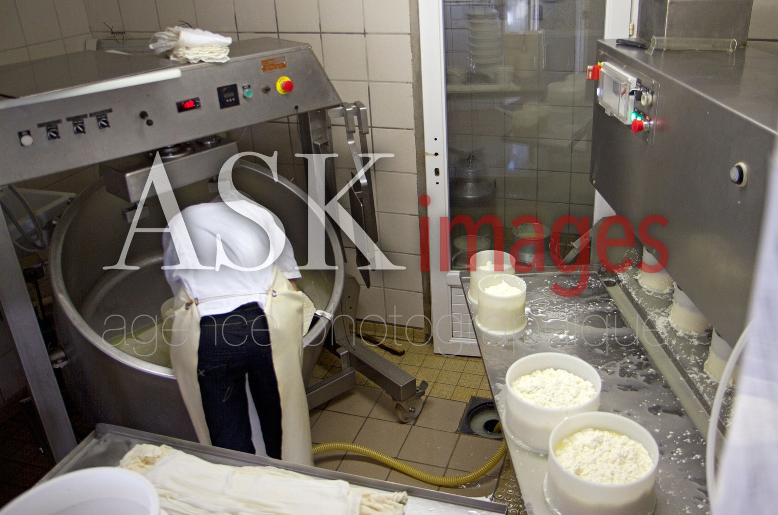 | Description | Auvergne, Puy-de-Dome, Saint Nectaire cheese, Farm and Production, famer extracting the cream from the brewed milk |