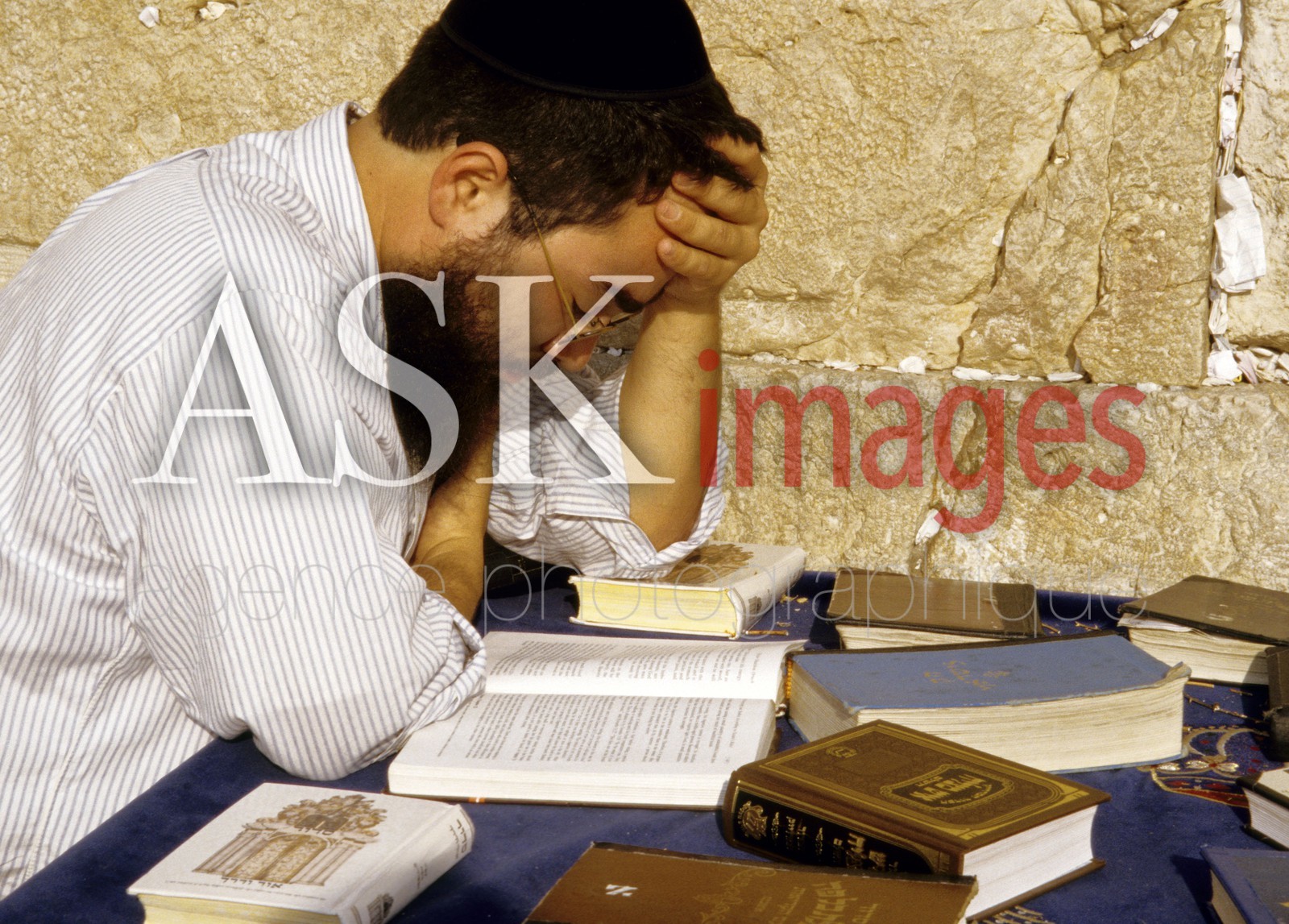 | Description | Talmudic student studying texts at Western Wall in Jerusalem |
