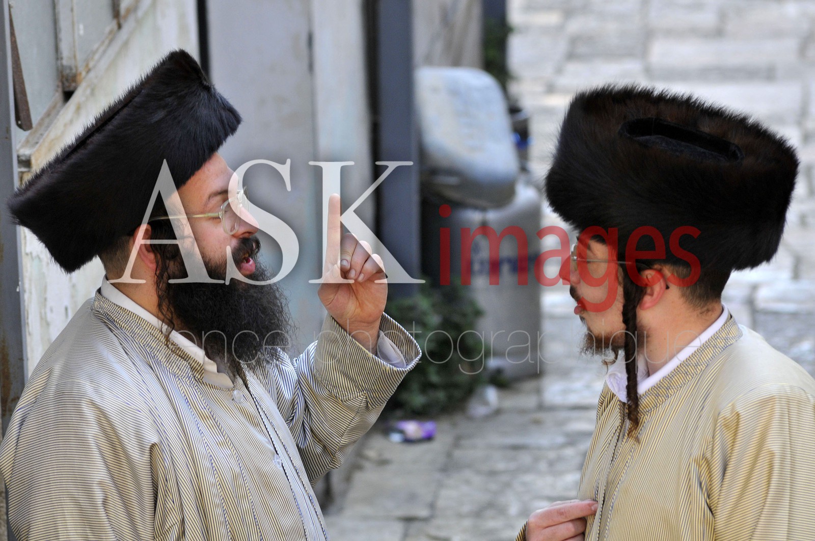 | Description | Israel . Jerusalem . Hassidim a Mea shearim . Hassidim speaking on the street of Mea Shearim . |