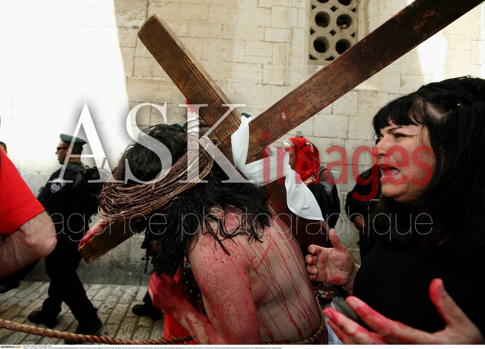 | Description | ISRAEL / Jerusalem /Good Friday / Easter.Reenactment of the Jesus final journey through the Via Dolorosa - the actor carries a wooden cross on his bare back. His face and body smudged with fake blood, and a crown of thorns on his head. Roman soldiers with red-plumed helmets push him forward..© Moshe Shai / Anzenberger/ASK Images |