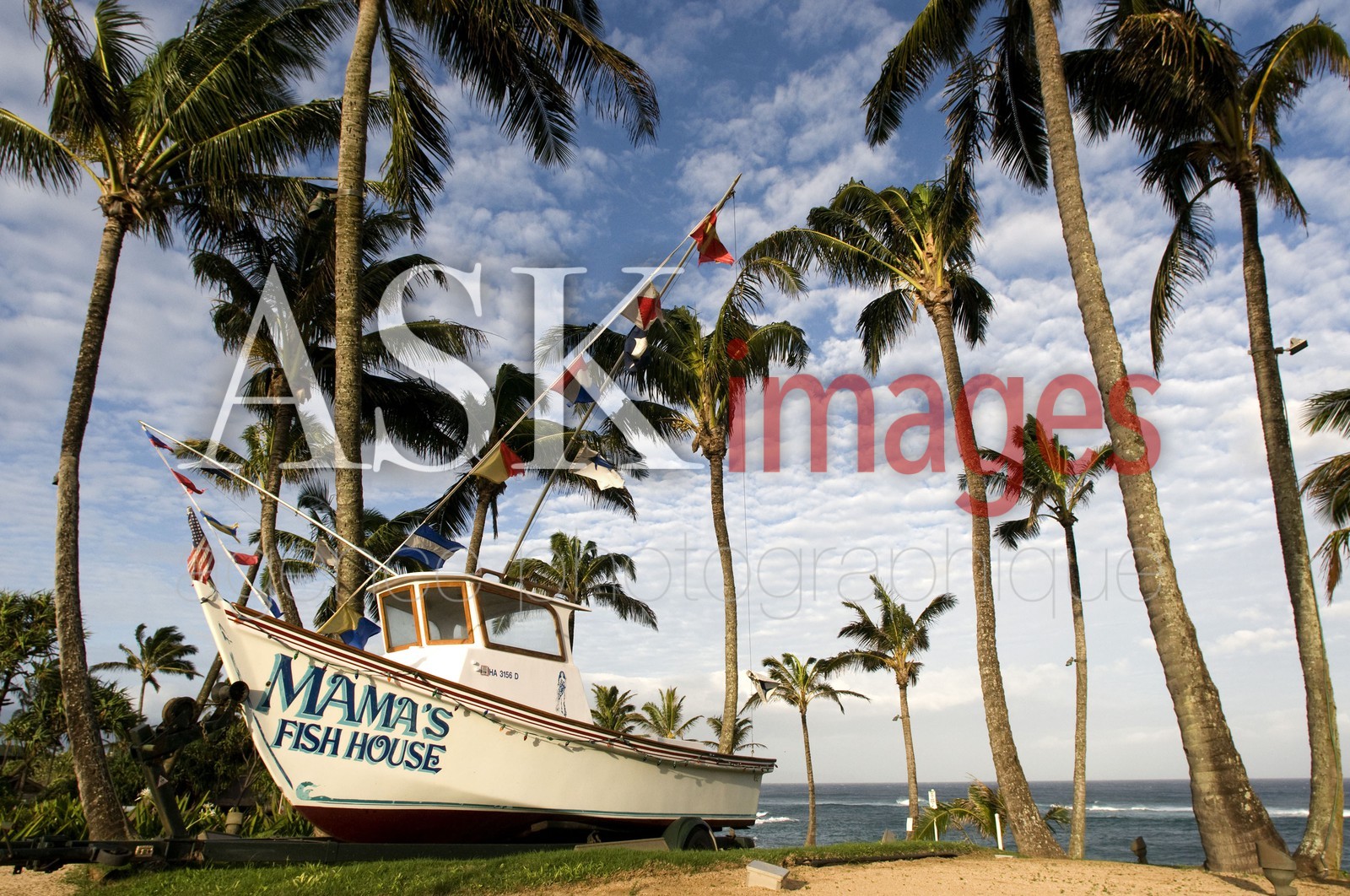 | Description | Mama’s Fish House Restaurant. Ho’okipa Beach Park. Maui. Famous Mamas Fish House with palms and beach in Maui Hawaii. |