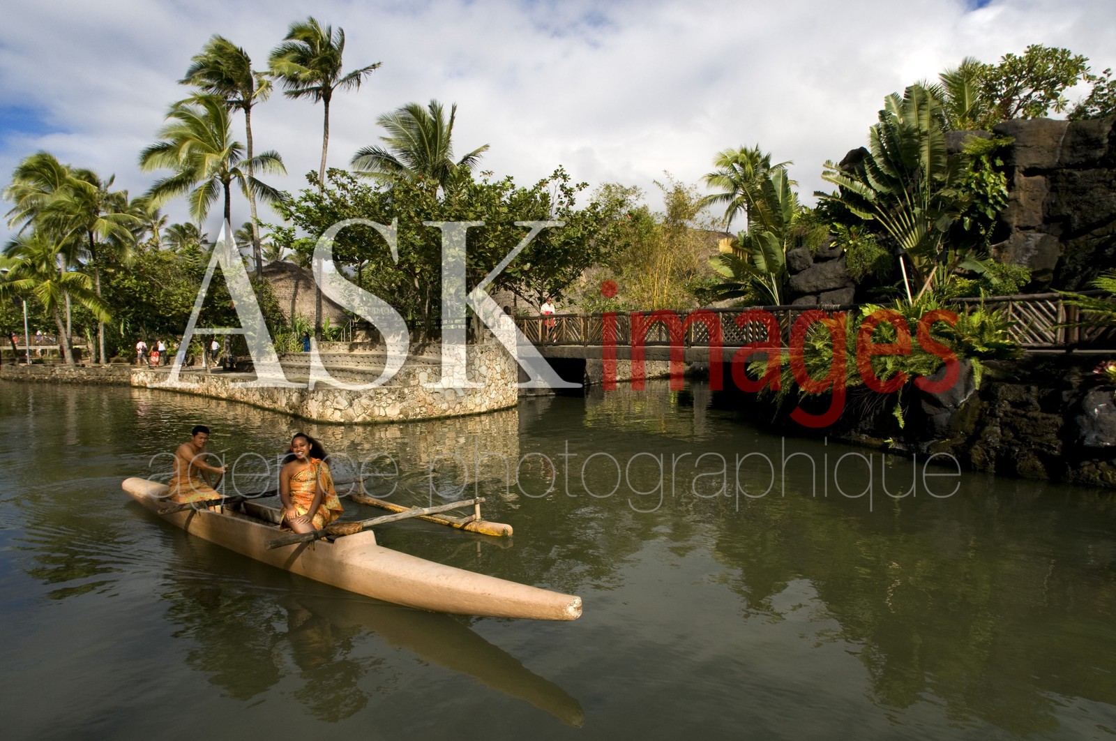 | Description | Canoe navigating the canal running through the park. Polynesian Cultural Center. O'ahu. Hawaii. Polynesian Cultural Center. O'ahu. Hawaii. |